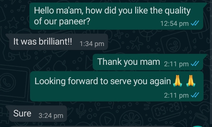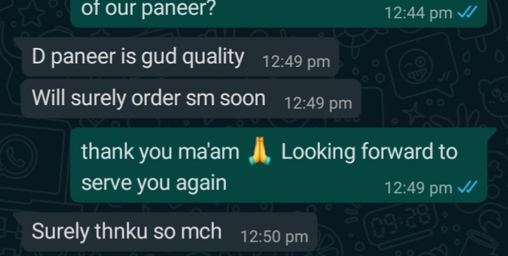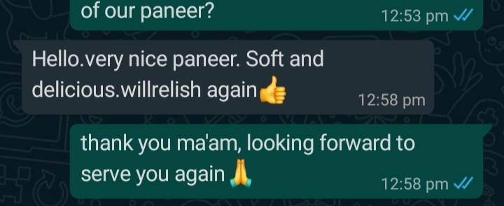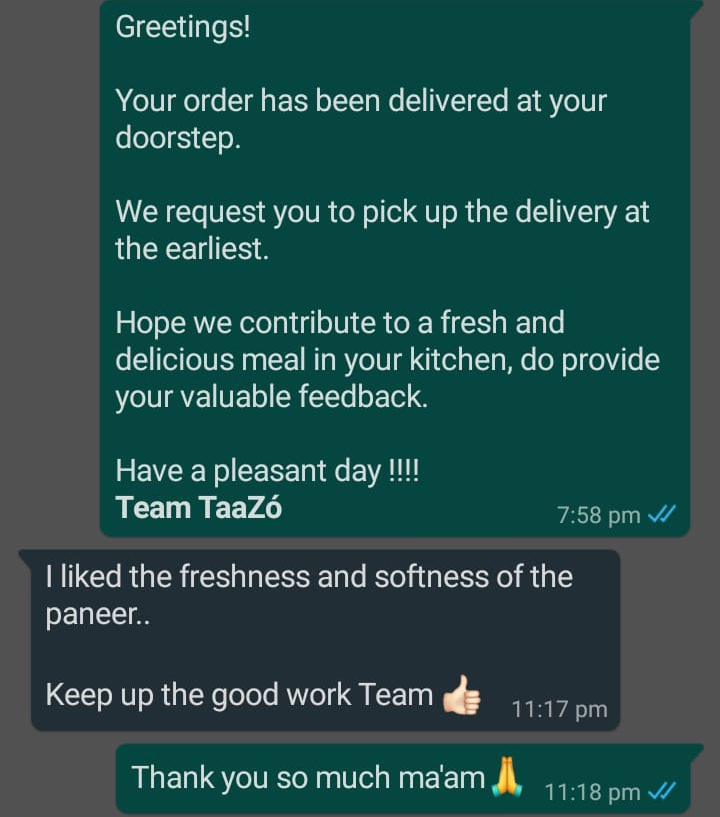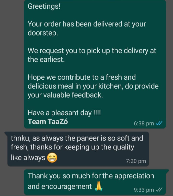 We've made subscribing to Taazo paneer incredibly convenient for you. Simply share the number of packets you require and the specific delivery days through our WhatsApp chat. Once you've provided these details, we'll take care of the rest. Each morning, your doorstep will welcome a fresh delivery of Taazo paneer, all without the need for reminders.